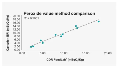 Phương pháp CDR để xác định chỉ số peroxit của dầu và mỡ cho thấy sự tương quan rất tốt với phương pháp tham chiếu: Phương pháp chính thức AOCS Cd 8-53. Ngoài ra, phòng thí nghiệm tham chiếu quốc tế Campden BRI đã thực hiện các thử nghiệm so sánh giữa phương pháp của CDR FoodLab® để xác định chỉ số peroxit và phương pháp chuẩn độ được UKAS công nhận do Campden BRI sử dụng (Phương pháp Campden BRI TES-AC-360 dựa trên ISO 3960 hoặc AOCS Cd 8b-90 hoặc AOAC 965.33): hệ số tương quan là R² = 0,9681, giá trị này cho thấy sự tương quan giữa hai phương pháp là rất tốt.